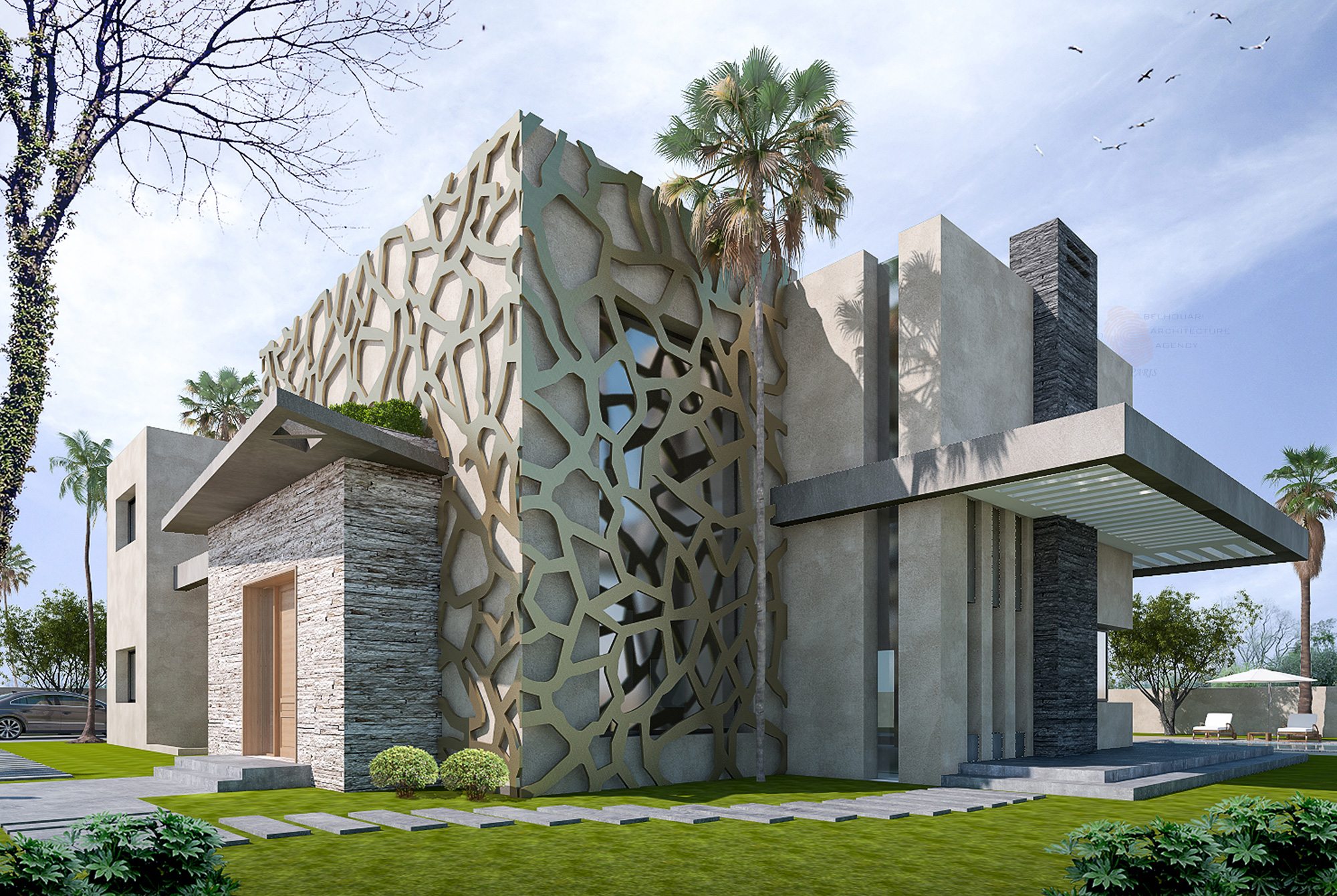 La Villa M.N. à la Palmeraie Marrakech présente une alliance remarquable entre géométrie contemporaine et art marocain. Sa façade se distingue par un moucharabieh sculptural qui filtre la lumière et crée des jeux d’ombres élégants, apportant profondeur et intimité. La composition équilibre les textures brutes — pierre, béton et métal — avec un paysage verdoyant, établissant un dialogue raffiné entre design moderne et sérénité naturelle.