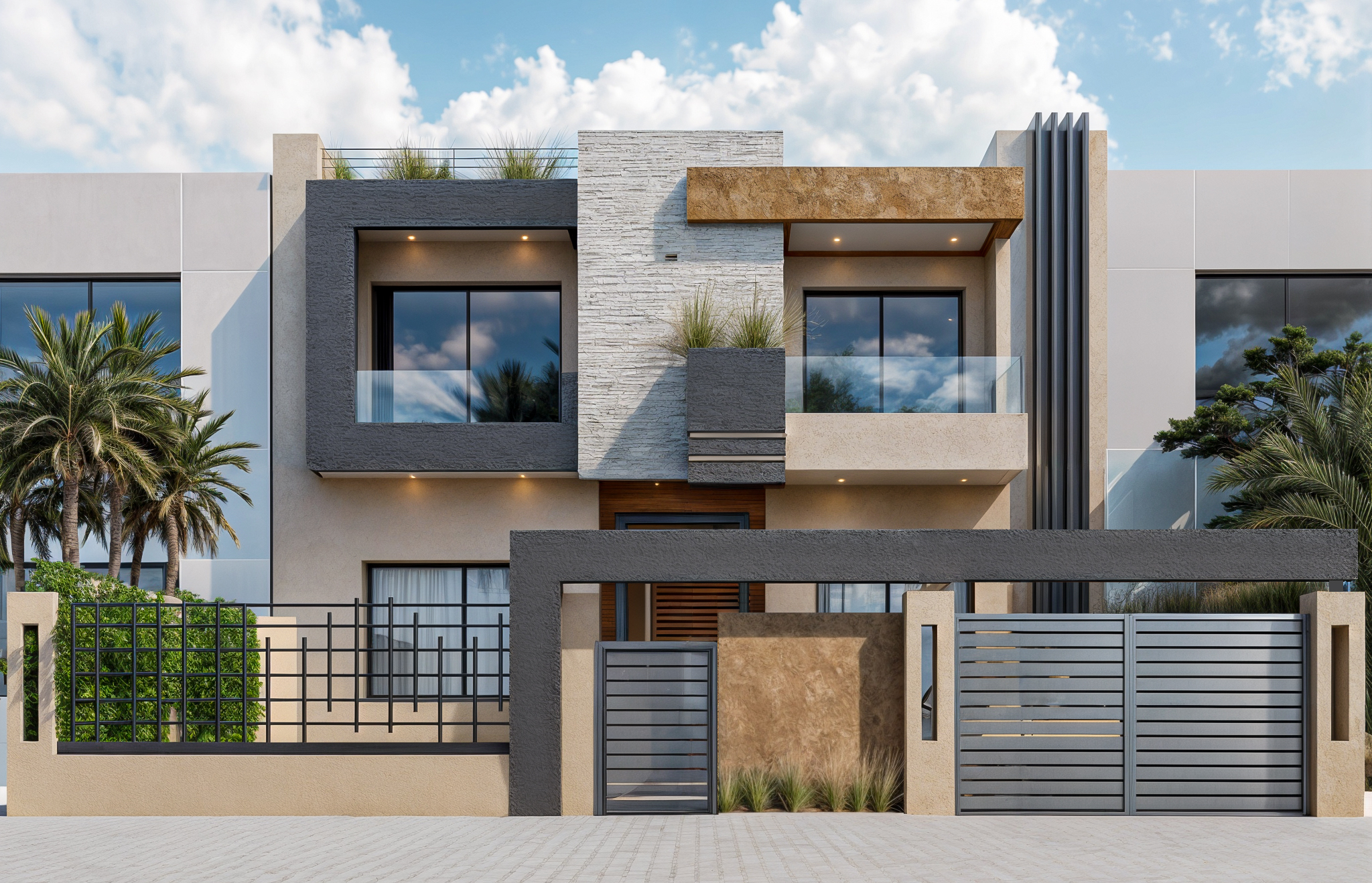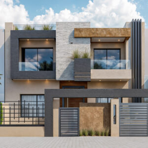 La Villa B.M à Gharnata se distingue par une géométrie équilibrée et des contrastes élégants. La façade marie pierre texturée, cadres sombres et tons chauds pour une allure contemporaine raffinée. De larges baies vitrées favorisent la lumière naturelle et l’ouverture sur l’extérieur. Le design reflète la sophistication, le confort et l’harmonie architecturale.